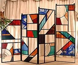 Main Album » Screens & Garden Art Hand painted & fired panels restore an ornate Victorian Screen Victorian Screen - detail Rondel design in antique oak screen. Victorian metal screen. Art Nouveau Metal Screen Abstract Metal Screen Abstract screen for garden situation. Stained Glass Triptych